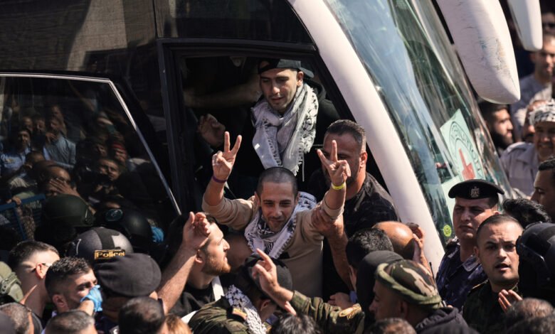Cientos vitorearon cuando dos autobuses que transportaban a decenas de prisioneros liberados llegaron a Beitunia en la Cisjordania ocupada por Israel. Los hombres liberados, con la cabeza rapada, descendieron del autobús haciendo señales de victoria con los dedos; algunos fueron levantados sobre los hombros de la multitud, mientras que otros se hundieron en sillas cercanas, exhaustos.